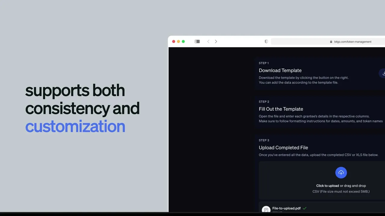 Token Management by BitGo presents an elegant visual narrative of full lifecycle operations—grant creation, vesting, distribution, and staking—all unified under BitGo’s regulated custody infrastructure. Tailored for foundations, protocols, and crypto ventures, this platform transforms token operations into a seamless, secure experience.